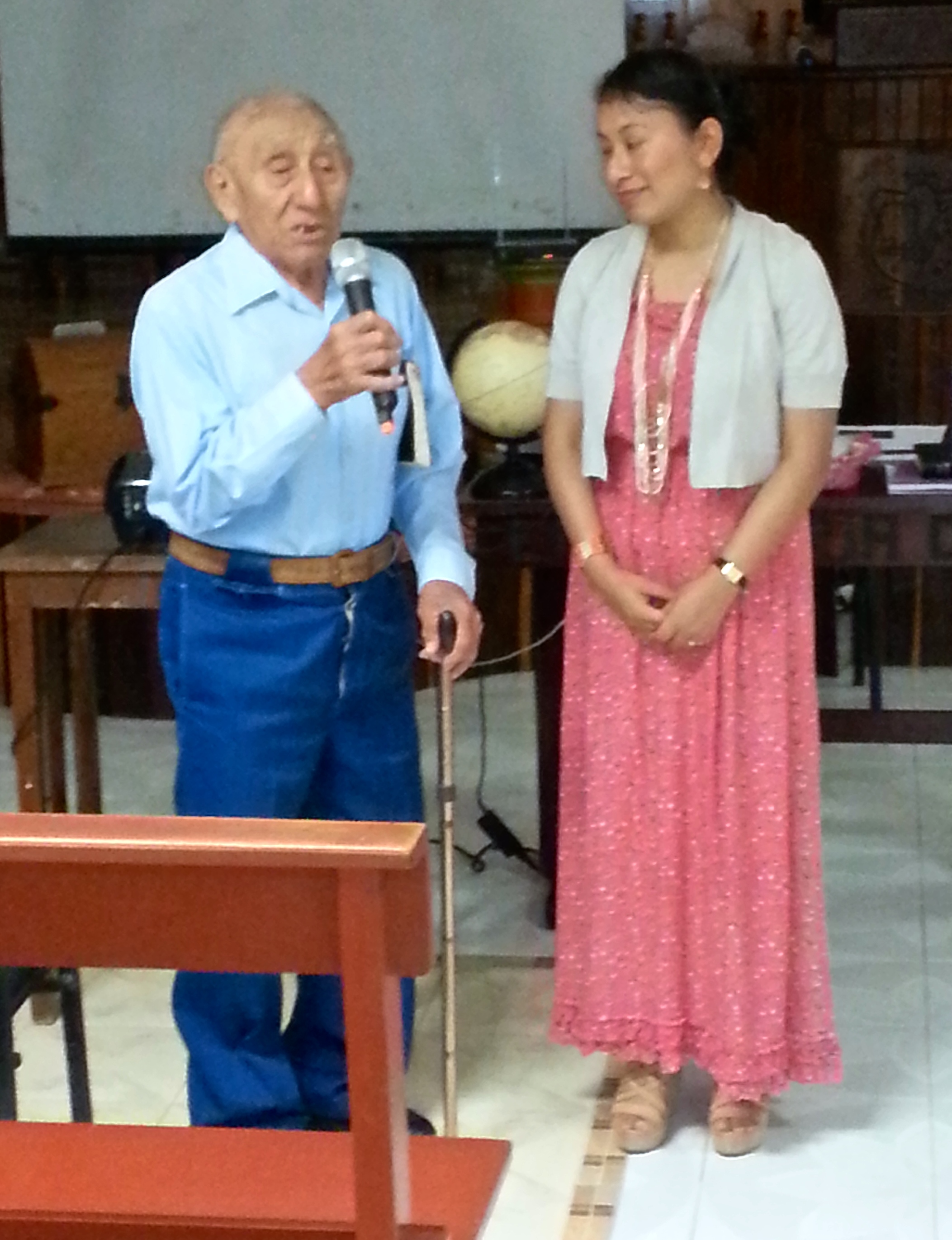 Father of FIVE pastors, 101 year old, Marcelino Coyoc Dzul, joins Francelia in exhorting parents and leaders to a greater commitment to biblical Christian education in the home and the church ~ Monte de los Olivos Church, Campeche, Campeche